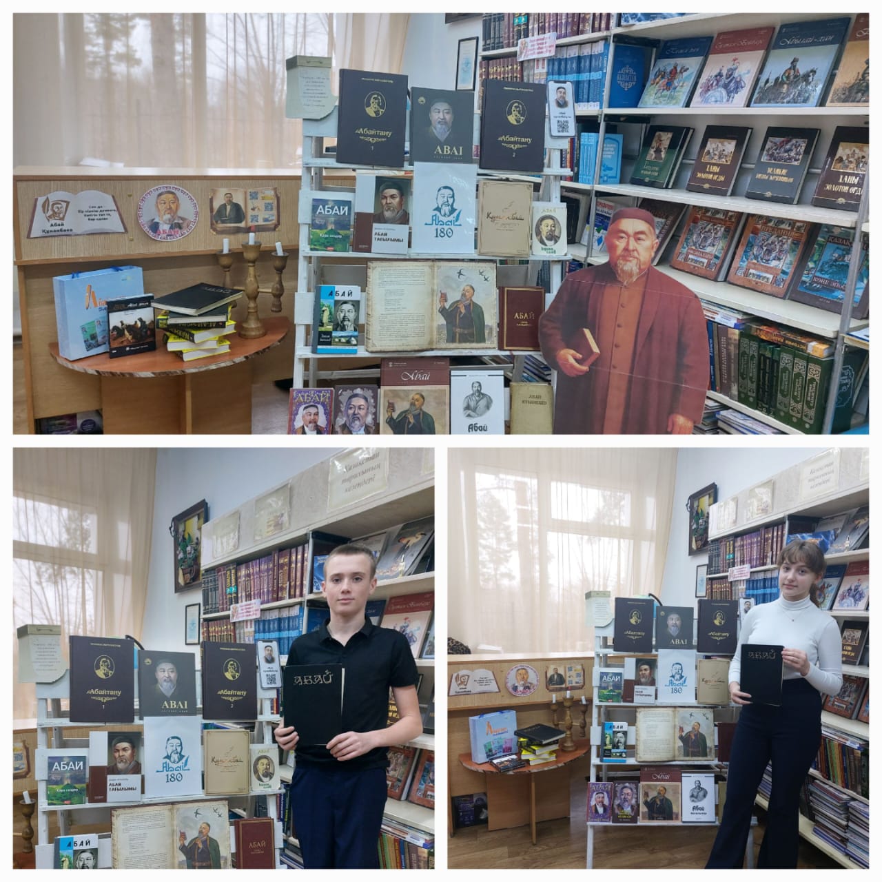 В школьной библиотеке, у книжной выставки, посвящённой 180- летию Абая Кунанбаева прошёл конкурс чтецов,который включает в себя художественное чтение стихов и отрывков из его произведений