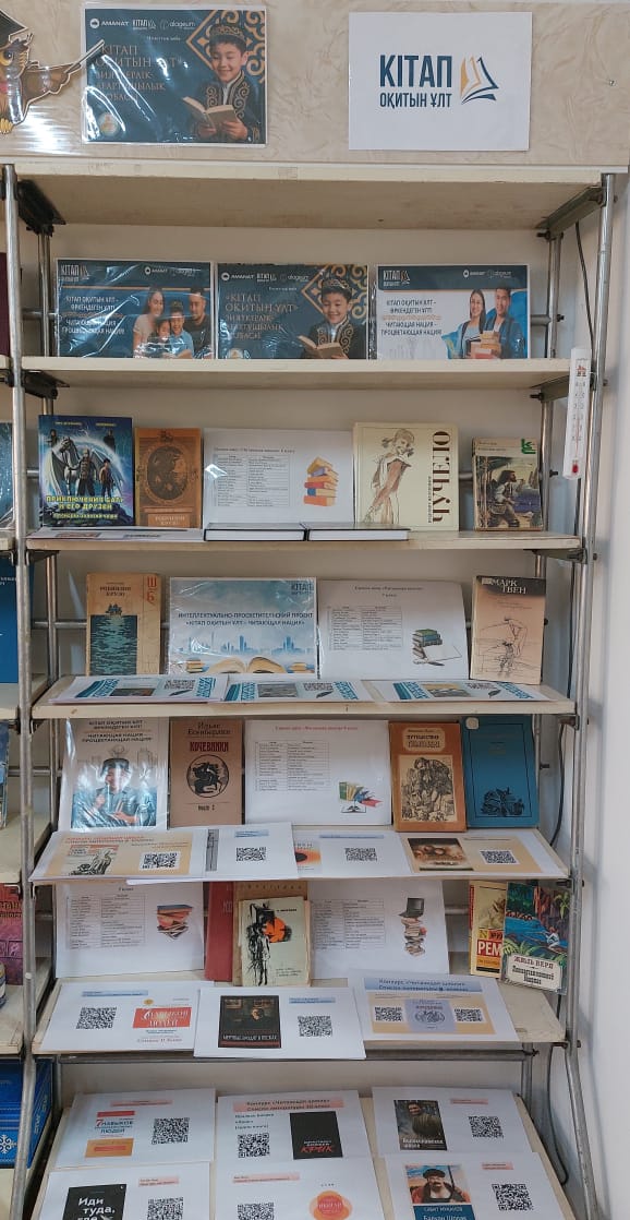 "Кітап оқитын ұлт" жобасын іске асыру мақсатында мектеп кітапханасында кітап көрмесі рәсімделді, онда оқушылар мен педагогтар кюар кодтары бар әдебиеттер тізімімен танысып қана қоймай, шығармаларды өздері де ала алады.