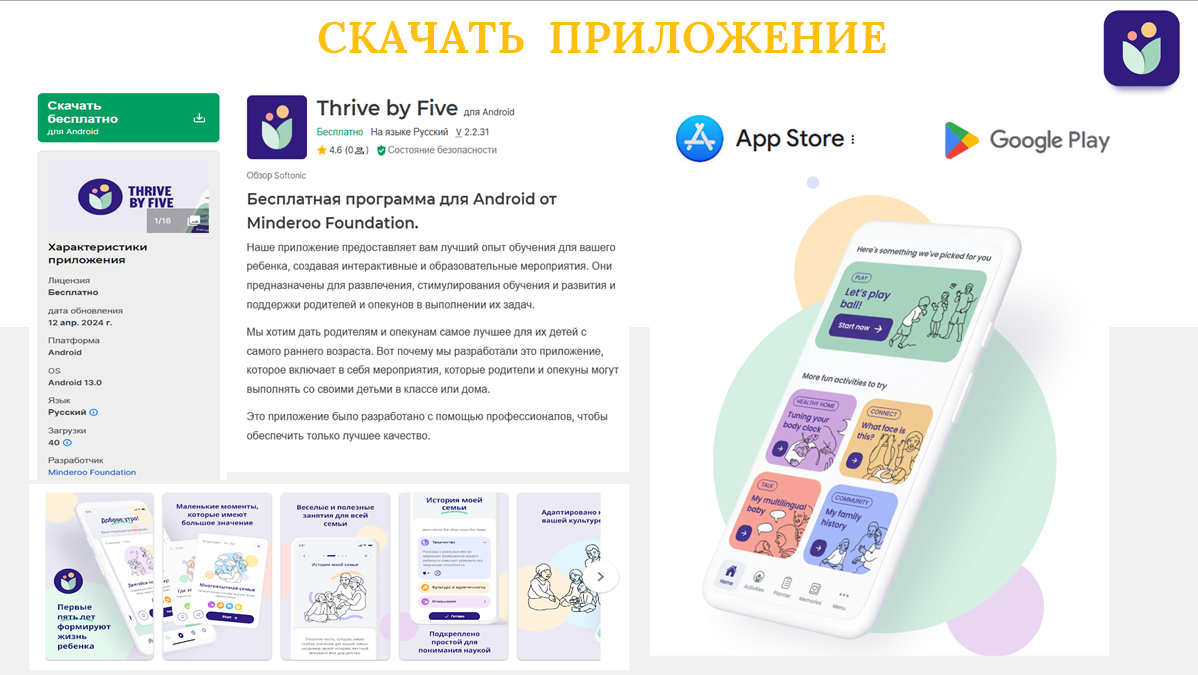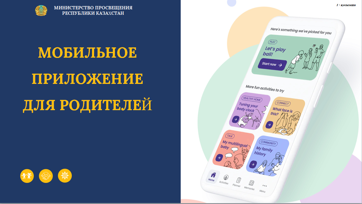 Мобильное приложениепредоставляет для родителей, воспитывающих детей в домашних условиях, легкодоступные короткие практические активностипо здоровью и питанию, воспитанию, развитию творческих и коммуникативных навыков, играм и взаимоотношениям. Контент предоставляет120 идей для занятий с детьми по 10 направлениямна казахском, русском и английском языках.